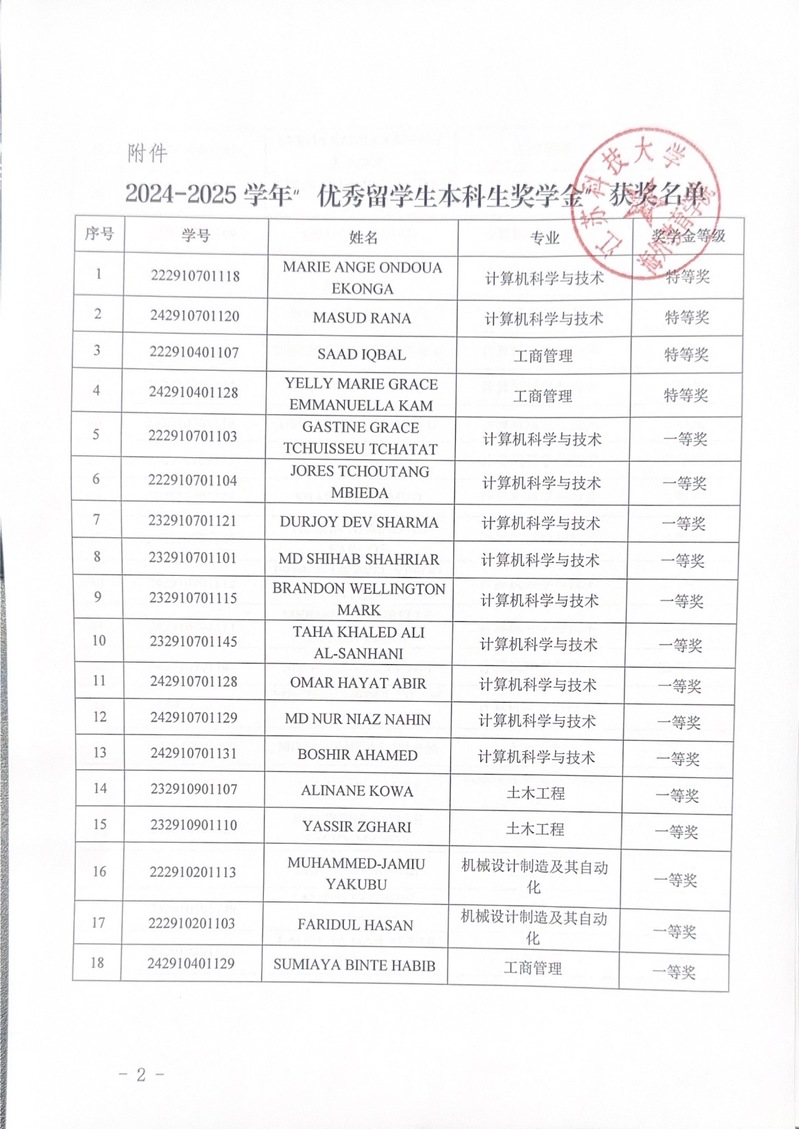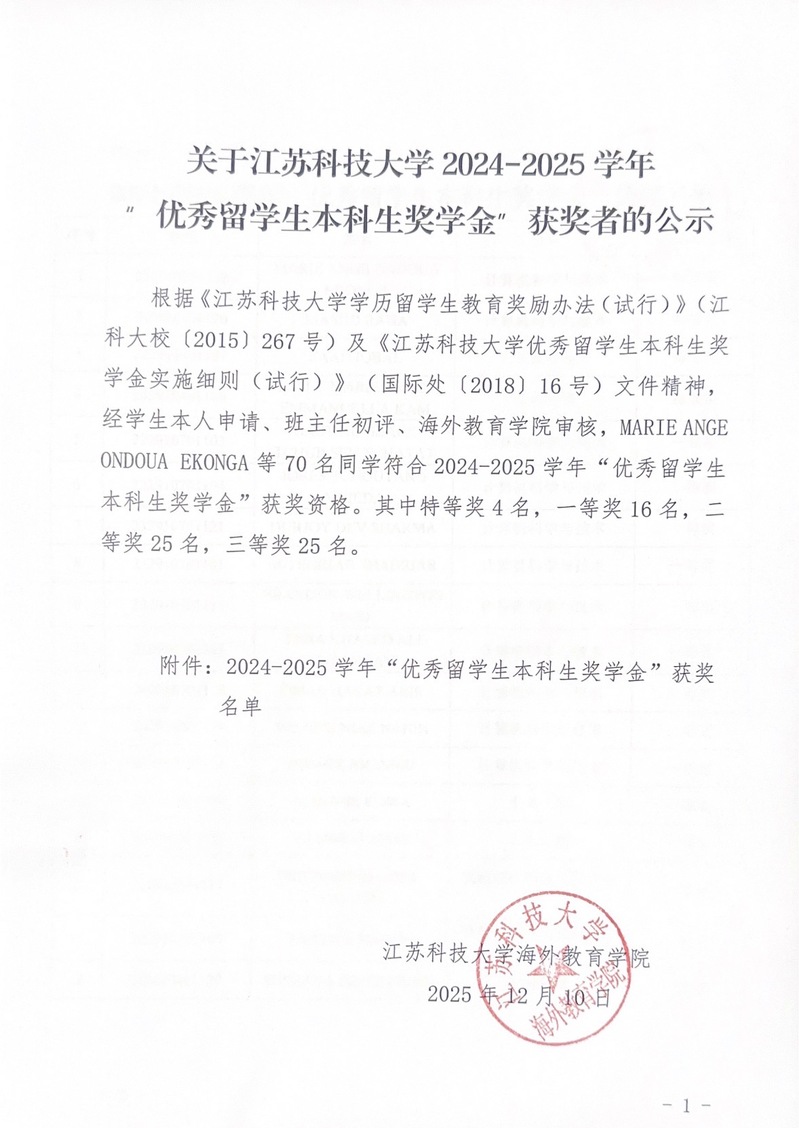 关于江苏科技大学2024-2025学年 “优秀留学生本科生奖学金”获奖者的公示